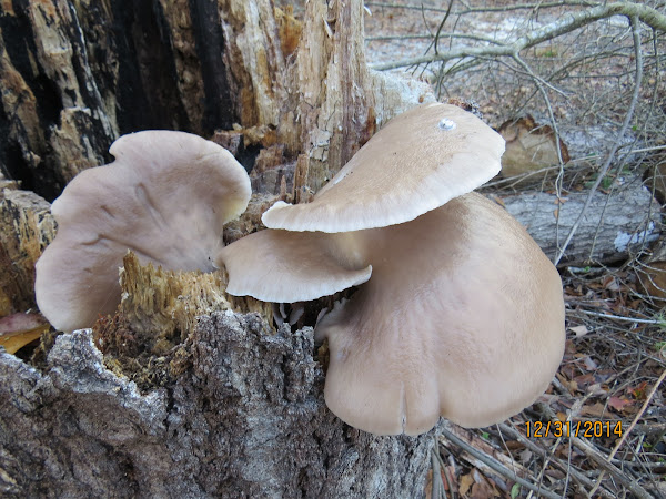Elephant ear or oyster mushrooms are fairly common edible mushrooms that grow on the side of trees.